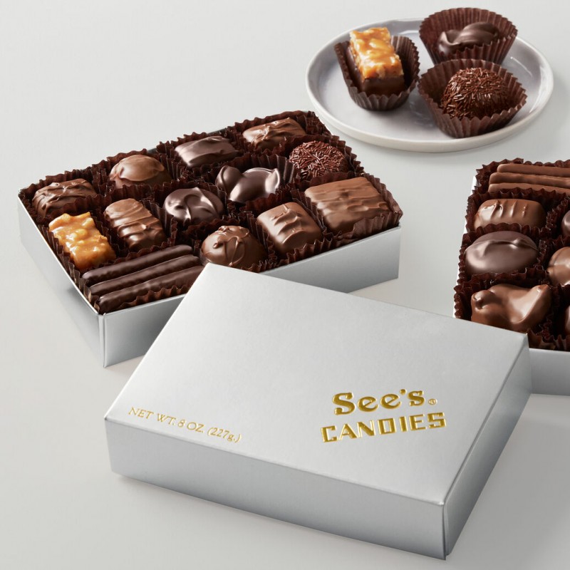 This gleaming silver gift box holds a half-pound assortment of See's favorite chocolates. Approximately 15 pieces*: