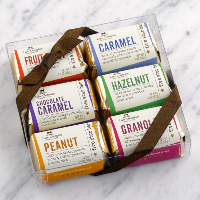 When it comes to Five Star Bars, everyone has a favorite . . . and the best way to find yours is to try as many as you can! This six-piece, Fair Trade Certified™ gift pack features: original Caramel, popular Hazelnut, crispy Peanut Butter, tempting Fruit & Nut, crunchy-chewy Granola, and rich Chocolate Caramel. As featured in Steve Almond's book, Candyfreak — yes, these are the ones!